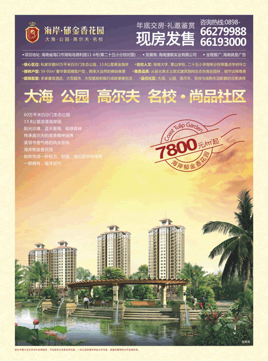 海南就是廣告有限公司為海岸郁金香花園項目獨家整合推廣代理商,負責(zé)項目整合推廣,合約推廣期為2年,從前期市場策劃到項目定位、VIS形象設(shè)計、全程營銷策劃、執(zhí)行,就是廣告一直以高度熱情的工作態(tài)度,認真、負責(zé)地專業(yè)精神克服了重重困難,以一天銷售114套的驚天銷量,橫掃整個海南房地產(chǎn)市場。